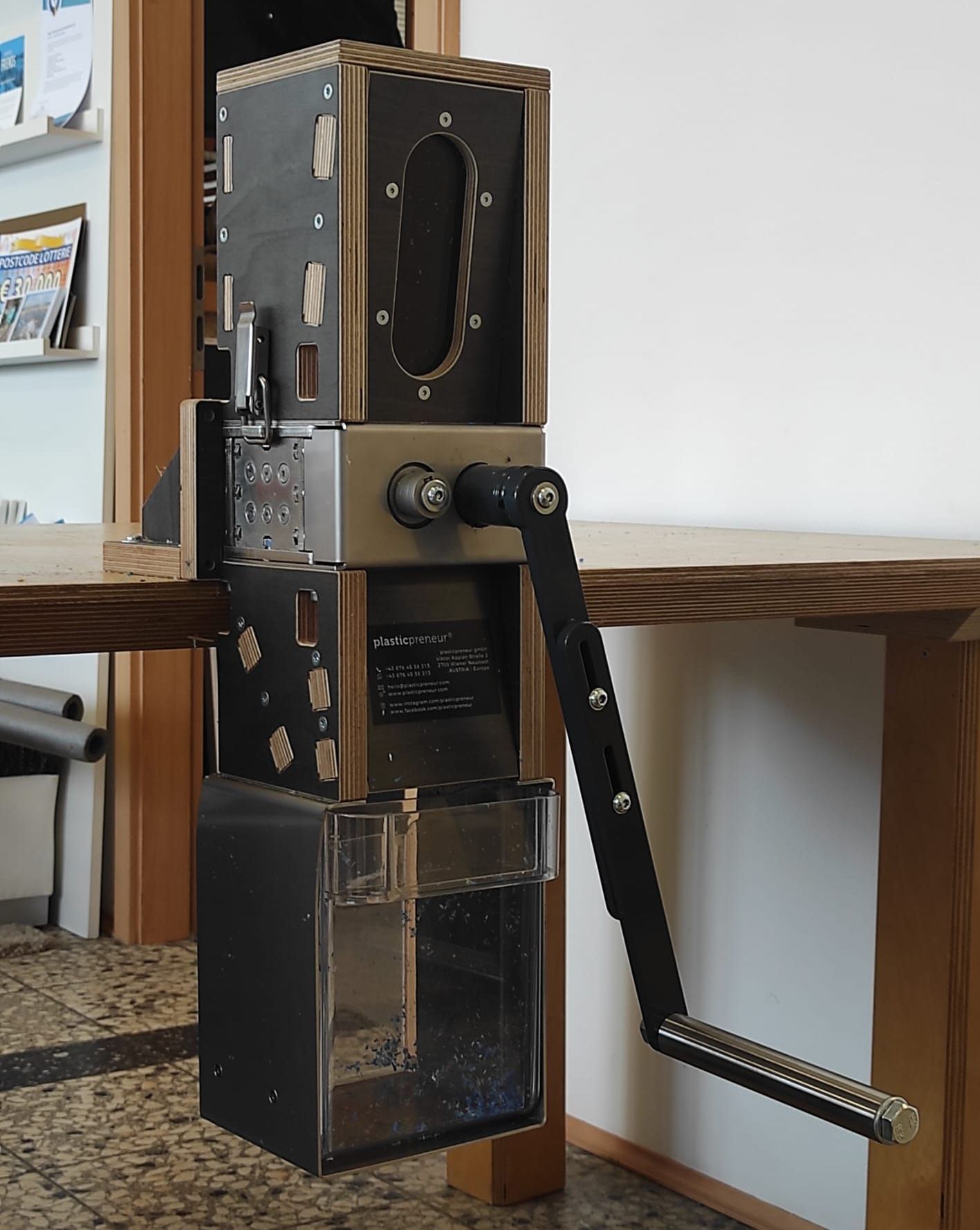 Im Vorhinein haben wir uns ausgiebig darüber Gedanken gemacht, wie wir die Recyclingwerkstatt realisieren wollen. Dabei sind wir auf das internationale Netzwerk "precious plastic" gestoßen, das detaillierte Anleitungen für den selbstständigen Bau der Maschinen bietet. Da uns allerdings die nötigen Kapazitäten und das KnowHow dazu fehlten, haben wir uns für die Recyclingmaschinen der österreichischen Firma "Plasticpreneur" entschieden. Die Maschinen konnten wir auch schon auf der Kunststoffmesse "K" im Oktober 2022 kennenlernen.